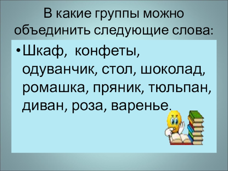 В какие группы можно объединить следующие слова:Шкаф, конфеты, одуванчик, стол, шоколад, ромашка, пряник, тюльпан, диван, роза, варенье.