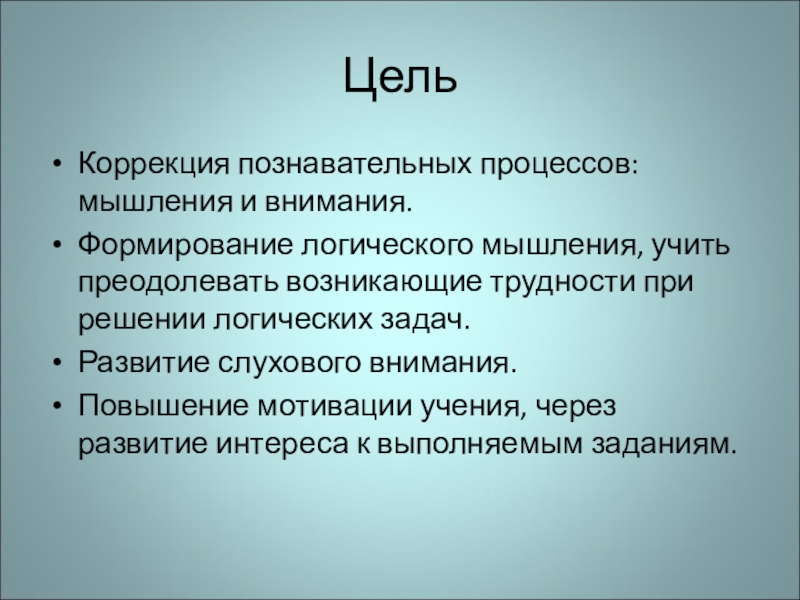 ЦельКоррекция познавательных процессов: мышления и внимания.Формирование логического мышления, учить преодолевать возникающие трудности при решении логических задач.Развитие слухового внимания.Повышение мотивации учения, через развитие интереса к выполняемым заданиям.