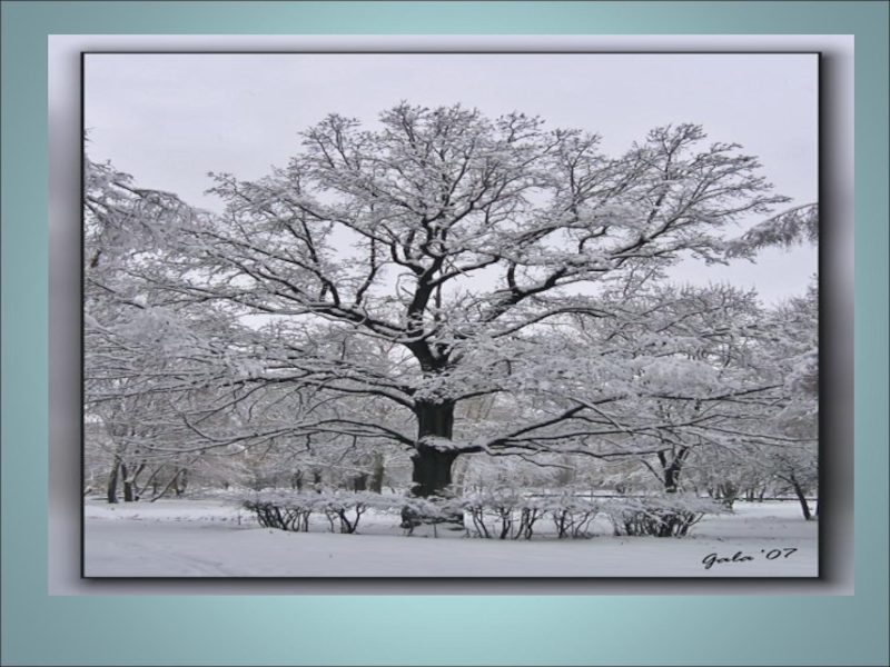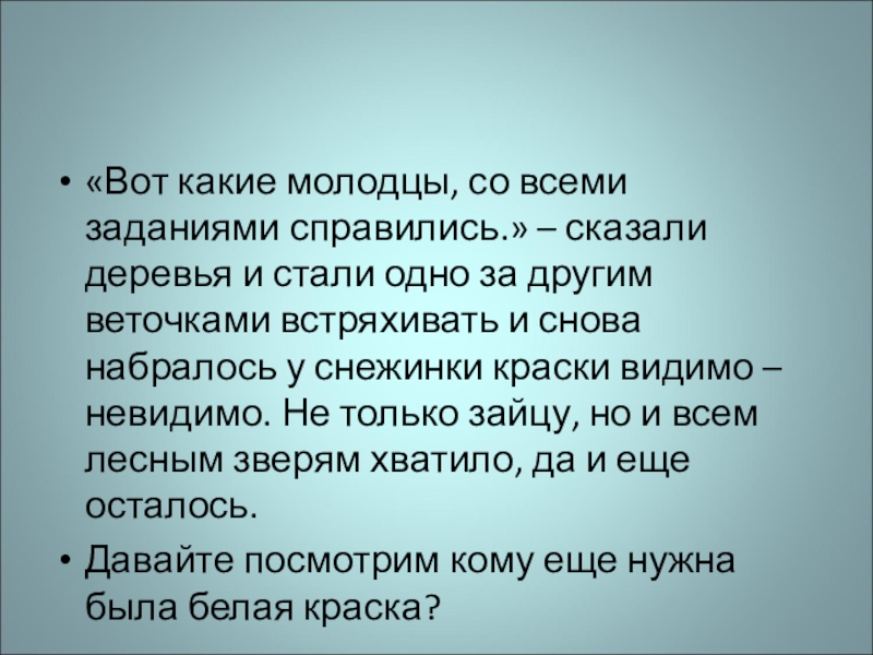 А в том лесу жил старый и могучий дуб. Говорит он деревьям:» А если бы мы остались зимой без теплых зимних накидок, как бы нам пришлось? Посмотрите как кА нас снежинка украсила! Не пострадают наши наряды если мы немного белой краски отдадим.» «Хорошо говорят деревья, только пусть снежинка сначала разгадает наши загадки , да выполнит задания»