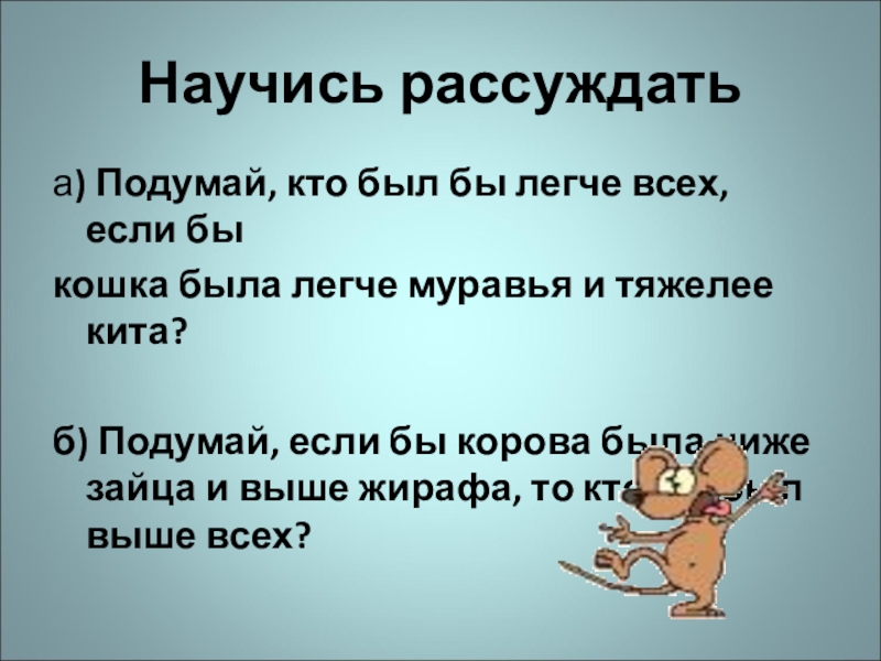 Научись рассуждатьа) Подумай, кто был бы легче всех, если бы кошка была легче муравья и тяжелее кита?б)
