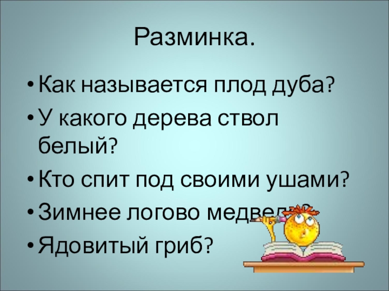 Разминка.Как называется плод дуба?У какого дерева ствол белый?Кто спит под своими ушами?Зимнее логово медведя?Ядовитый гриб?