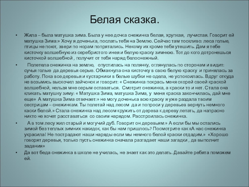 Белая сказка.Жила – была матушка зима. Была у нее дочка снежинка белая, хрупкая, лучистая. Говорит ей матушка