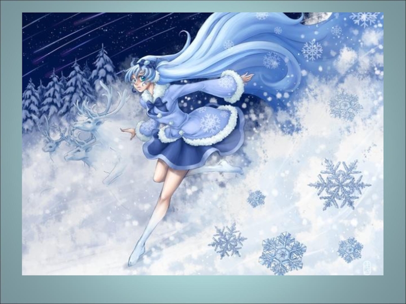 белая, хрупкая, лучистая. Говорит ей матушка Зима:» Хочу я доченька, послать тебя на Землю. Сейчас там тоскливо: леса голые, птицы не поют, звери по норам попрятались. Некому их кроме тебя утешить. Дам я тебе кисточку волшебную из серебристого инея и белую краску зимнюю. Тот до кого дотронешься кисточкой волшебной , получит от тебя наряд белоснежный.