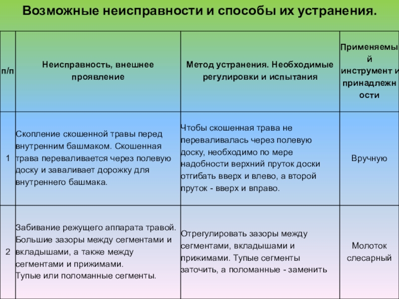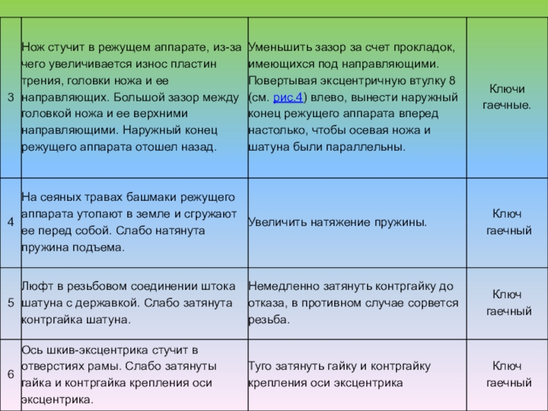 повышается сопротивление перемещению ножа в пальцевом брусе, что в свою очередь ведет к поломке деталей режущего аппарата и механизма его привода.
