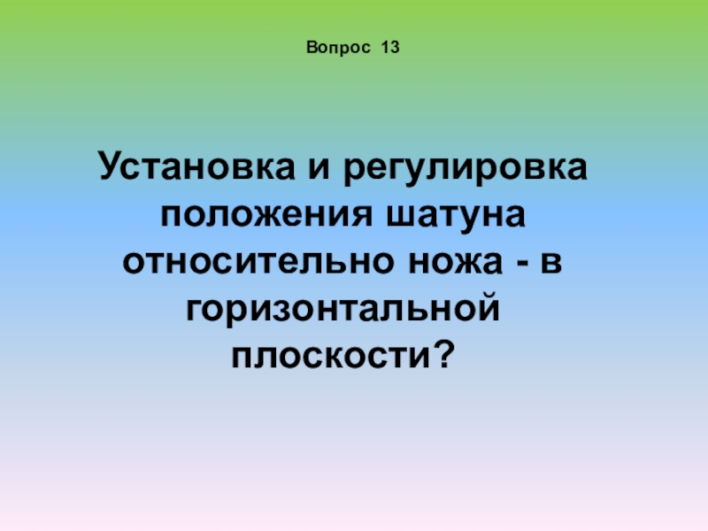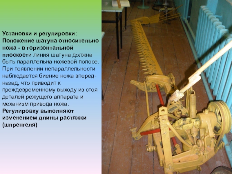 Слайд 73Установки и регулировки: Положение шатуна относительно ножа - в горизонтальной плоскости