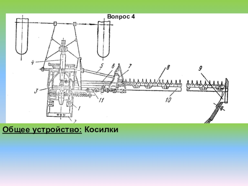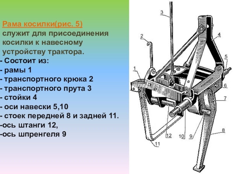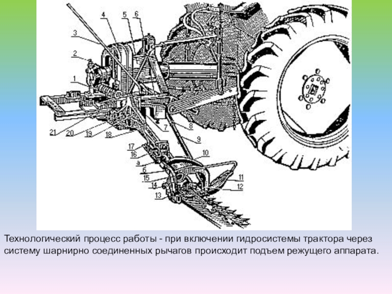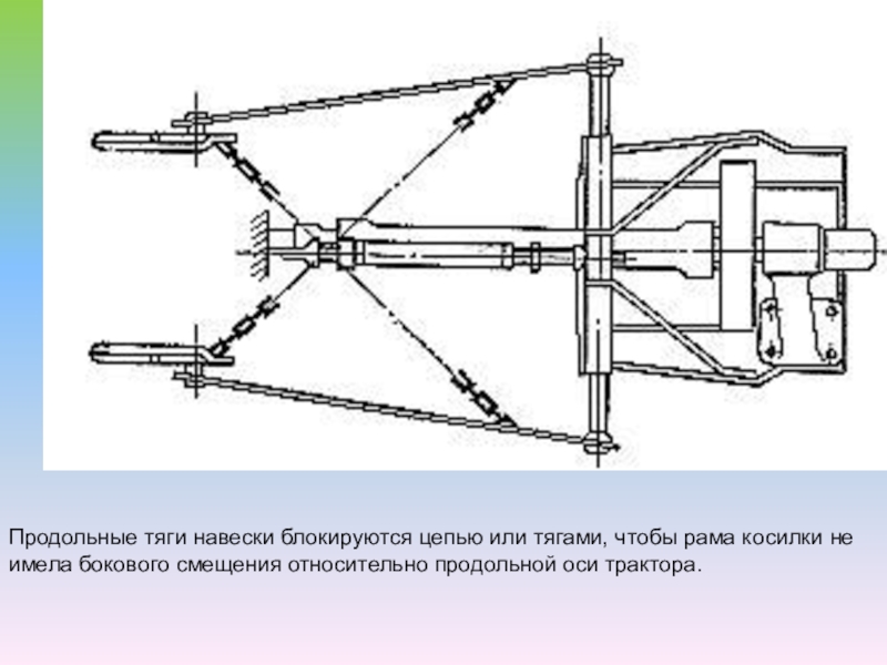Слайд 40Продольные тяги навески блокируются цепью или тягами, чтобы рама косилки не