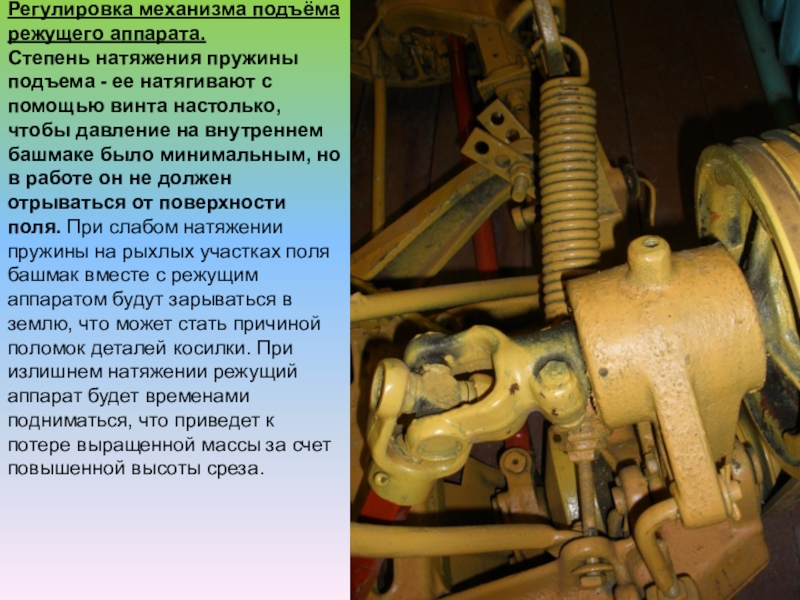 с помощью винта настолько, чтобы давление на внутреннем башмаке было минимальным, но в работе он не должен отрываться от поверхности поля. При слабом натяжении пружины на рыхлых участках поля башмак вместе с режущим аппаратом будут зарываться в землю, что может стать причиной поломок деталей косилки. При излишнем натяжении режущий аппарат будет временами подниматься, что приведет к потере выращенной массы за счет повышенной высоты среза.