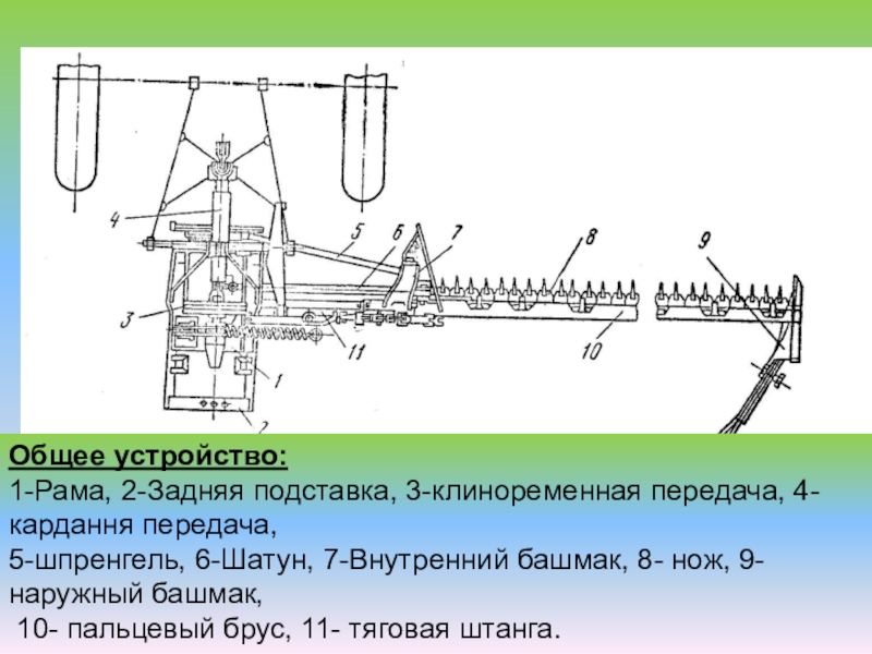 для соединения режущего аппарата с рамой косилки. Состоит из следующих основных сборочных единиц: кронштейна 1, тяговой штанги 2, рифленых сектора 5 и шайбы 4, кронштейна 6, шарнира башмака 7 и эксцентричной втулки 8.
