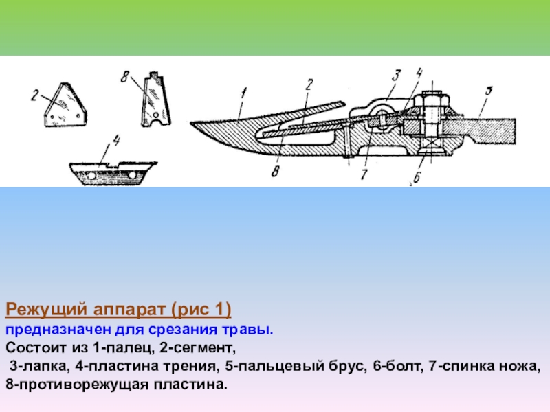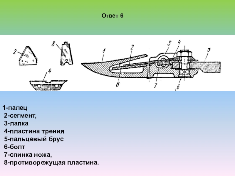 3-лапка, 4-пластина трения, 5-пальцевый брус, 6-болт, 7-спинка ножа,