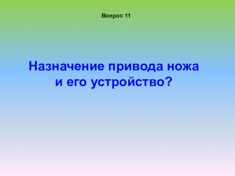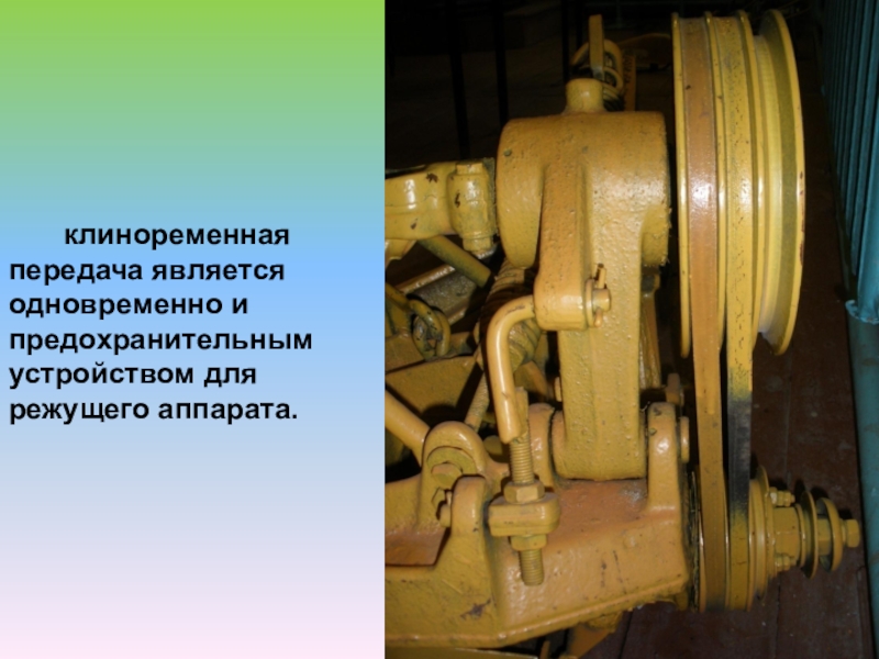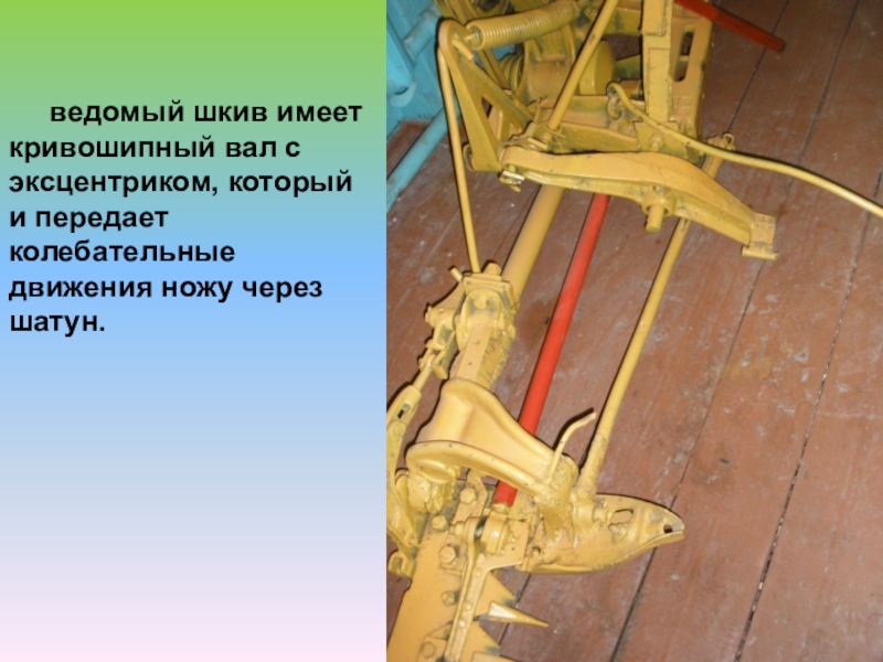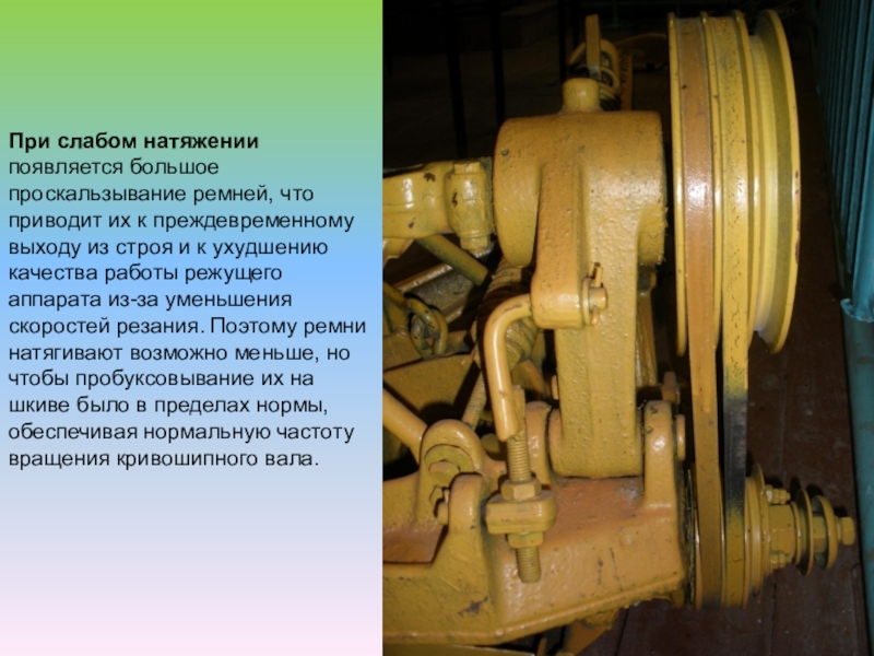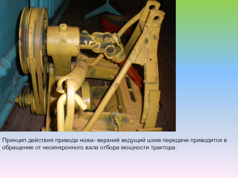 Слайд 27Принцип действия привода ножа- верхний ведущий шкив передачи приводится в обращение
