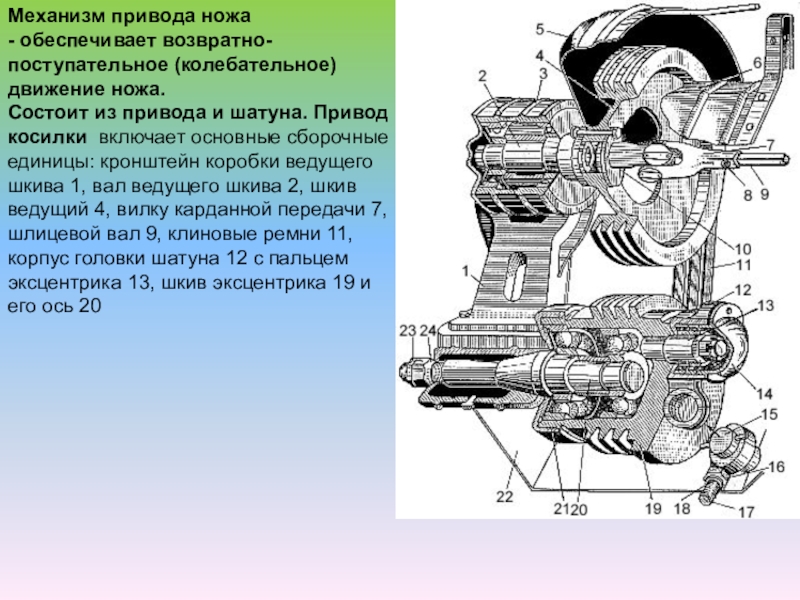и шатуна. Привод косилки включает основные сборочные единицы: кронштейн коробки ведущего шкива 1, вал ведущего шкива 2, шкив ведущий 4, вилку карданной передачи 7, шлицевой вал 9, клиновые ремни 11, корпус головки шатуна 12 с пальцем эксцентрика 13, шкив эксцентрика 19 и его ось 20