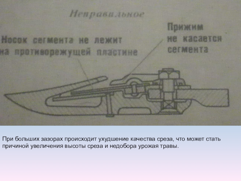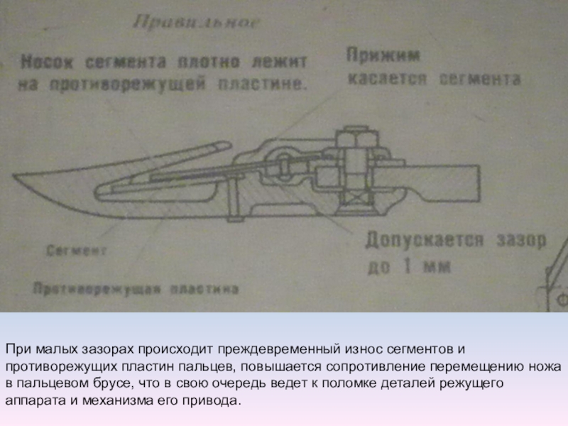 Слайд 17При малых зазорах происходит преждевременный износ сегментов и противорежущих пластин пальцев,