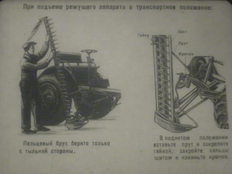 5.Навешивать и снимать косилку с трактора, а также производить исправление в косилке, регулировку и смазку можно только при заглушенном двигателе трактора.