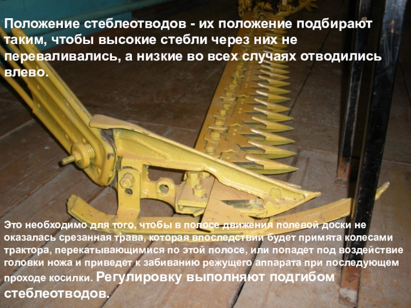 оказалась срезанная трава, которая впоследствии будет примята колесами трактора, перекатывающимися по этой полосе, или попадет под воздействие головки ножа и приведет к забиванию режущего аппарата при последующем проходе косилки. Регулировку выполняют подгибом стеблеотводов.