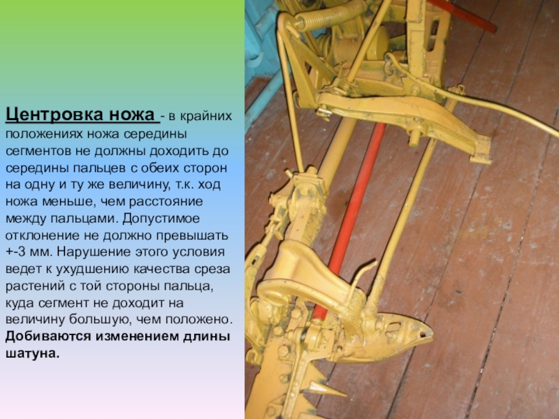 доходить до середины пальцев с обеих сторон на одну и ту же величину, т.к. ход ножа меньше, чем расстояние между пальцами. Допустимое отклонение не должно превышать +-3 мм. Нарушение этого условия ведет к ухудшению качества среза растений с той стороны пальца, куда сегмент не доходит на величину большую, чем положено. Добиваются изменением длины шатуна.