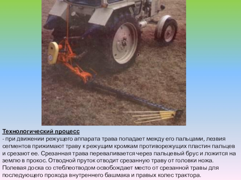 лезвия сегментов прижимают траву к режущим кромкам противорежущих пластин пальцев и срезают ее. Срезанная трава переваливается через пальцевый брус и ложится на землю в прокос. Отводной пруток отводит срезанную траву от головки ножа. Полевая доска со стеблеотводом освобождает место от срезанной травы для последующего прохода внутреннего башмака и правых колес трактора.