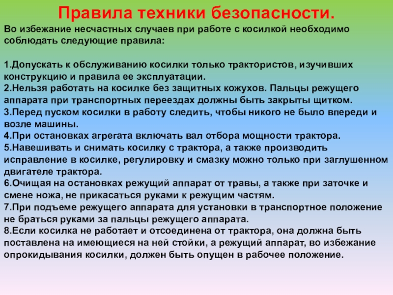 1.Допускать к обслуживанию косилки только трактористов, изучивших конструкцию и правила ее эксплуатации.