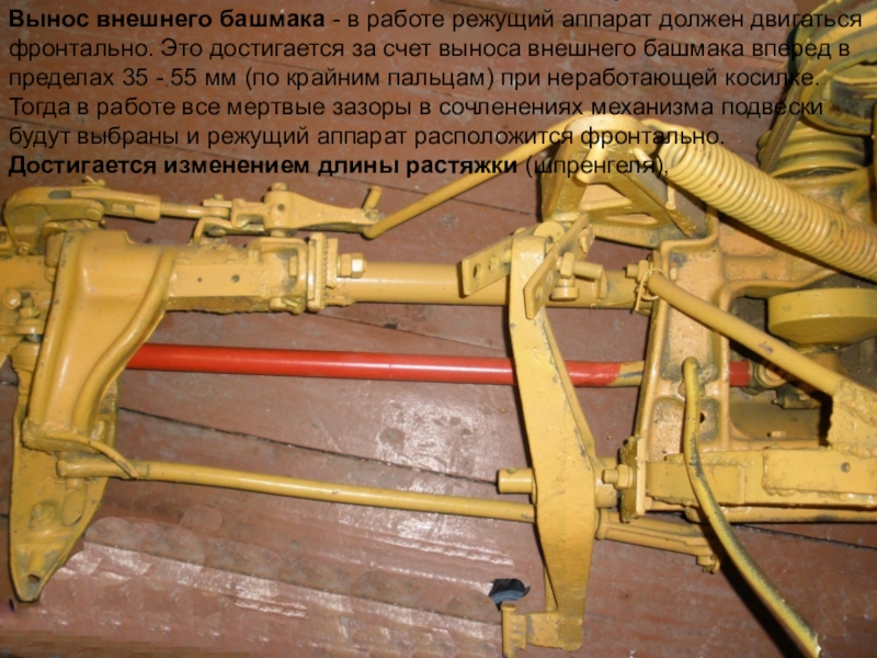 Это достигается за счет выноса внешнего башмака вперед в пределах 35 - 55 мм (по крайним пальцам) при неработающей косилке. Тогда в работе все мертвые зазоры в сочленениях механизма подвески будут выбраны и режущий аппарат расположится фронтально. Достигается изменением длины растяжки (шпренгеля),