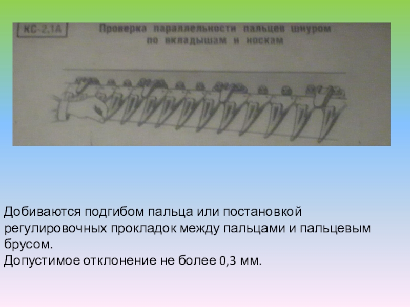 Слайд 14Добиваются подгибом пальца или постановкой регулировочных прокладок между пальцами и пальцевым