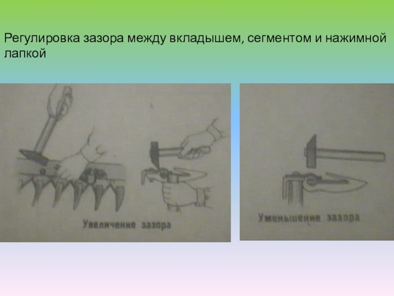 Слайд 15Регулировка зазора между вкладышем, сегментом и нажимной лапкой