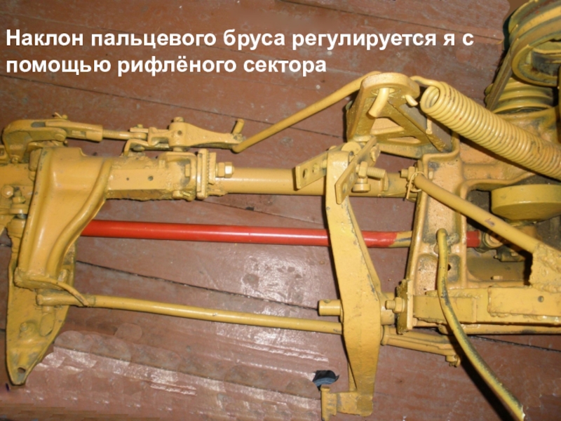 Слайд 22Наклон пальцевого бруса регулируется я с помощью рифлёного сектора