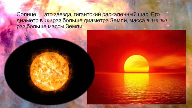 Слайд 4Солнце — это звезда, гигантский раскаленный шар. Его диаметр в 109
