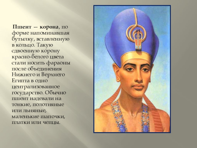 Слайд 15 Пшент — корона, по форме напоминавшая бутылку, вставленную в кольцо. Такую сдвоенную корону