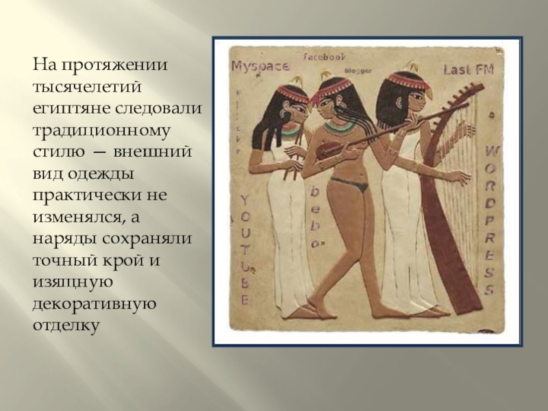 Слайд 5На протяжении тысячелетий египтяне следовали традиционному стилю — внешний вид одежды
