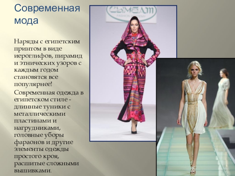 Современная одежда в египетском стиле - длинные туники с металлическими пластинами и нагрудниками, головные уборы фараонов и другие элементы одежды простого кроя, расшитые сложными вышивками.