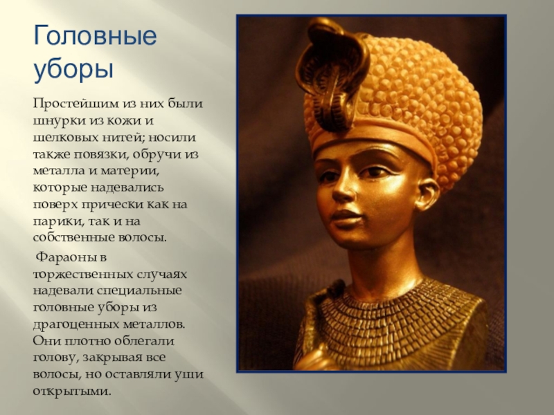 Фараоны в торжественных случаях надевали специальные головные уборы из драгоценных металлов. Они плотно облегали голову, закрывая все волосы, но оставляли уши открытыми.