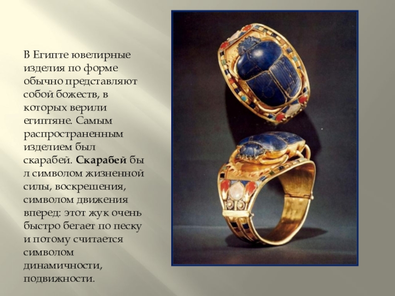 Слайд 23В Египте ювелирные изделия по форме обычно представляют собой божеств, в