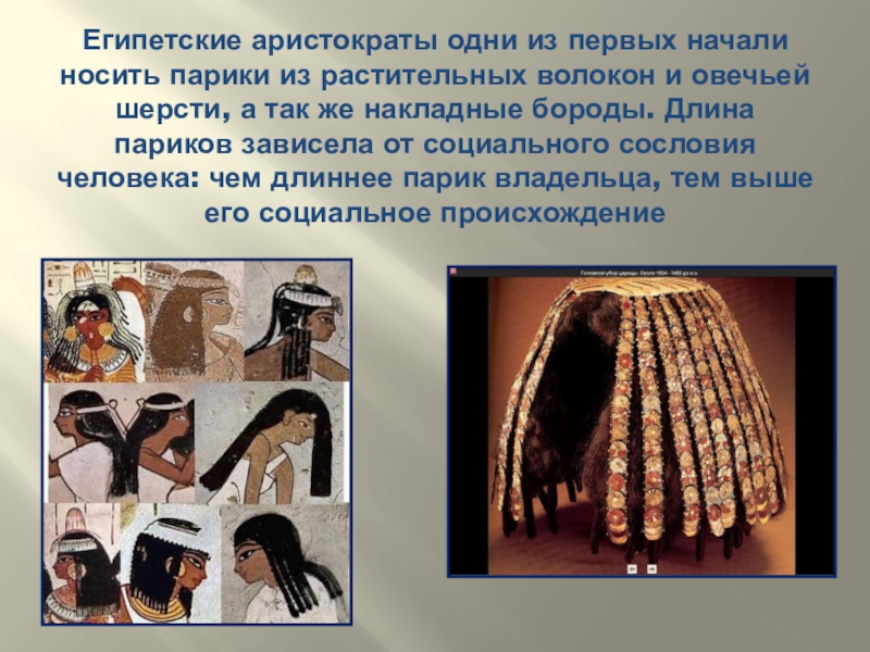 Слайд 19Египетские аристократы одни из первых начали носить парики из растительных волокон
