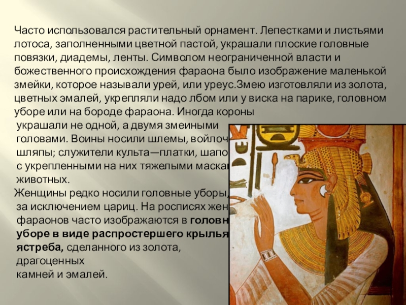 украшали плоские головные повязки, диадемы, ленты. Символом неограниченной власти и божественного происхождения фараона было изображение маленькой змейки, которое называли урей, или уреус.Змею изготовляли из золота, цветных эмалей, укрепляли надо лбом или у виска на парике, головном уборе или на бороде фараона. Иногда короны