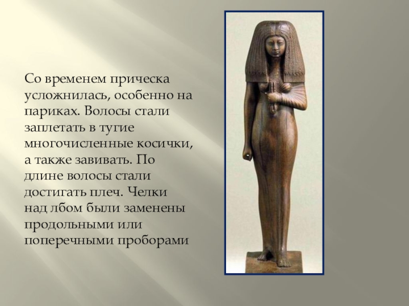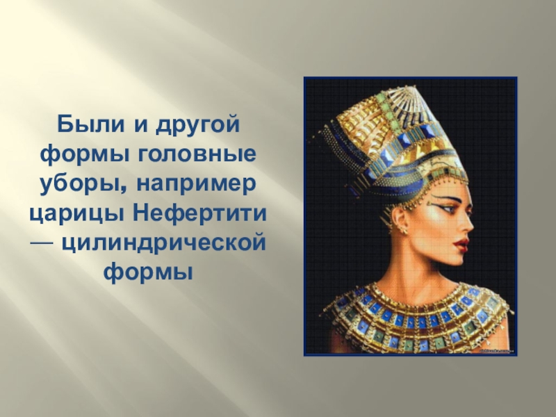 Слайд 18Были и другой формы головные уборы, например царицы Нефертити — цилиндрической формы
