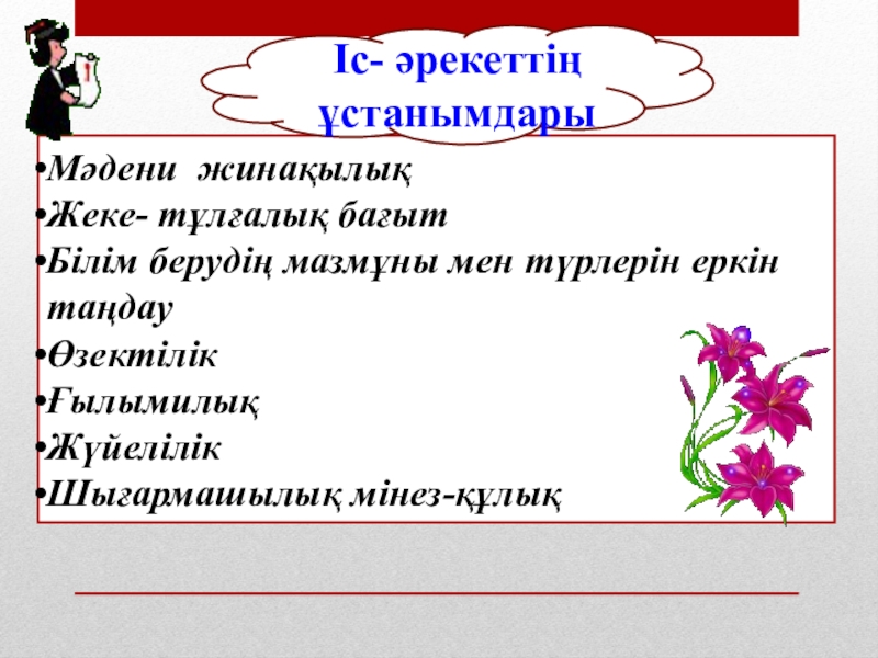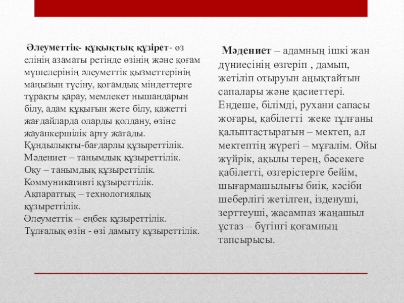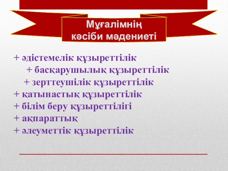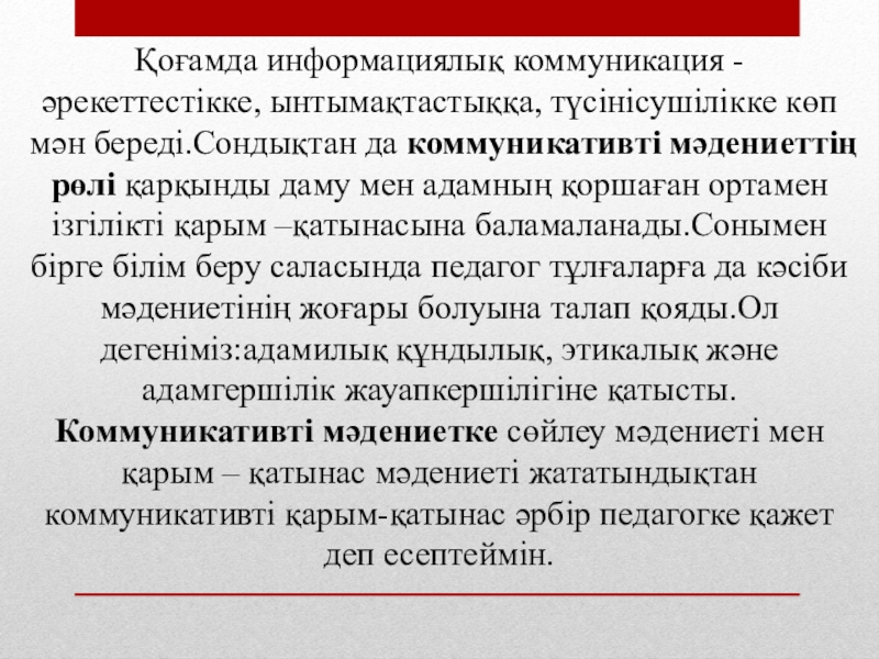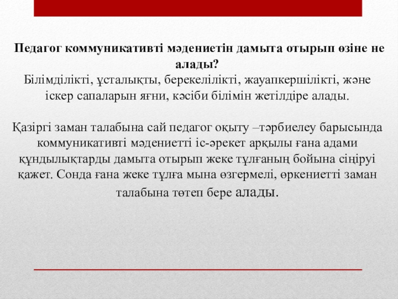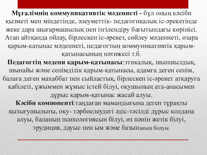 Мәдениет – адамның ішкі жан дүниесінің өзгеріп , дамып,жетіліп отыруын аңықтайтын сапалары және қасиеттері. Ендеше, білімді, рухани сапасы жоғары, қабілетті жеке тұлғаны қалыптастыратын – мектеп, ал мектептің жүрегі – мұғалім. Ойы жүйрік, ақылы терең, бәсекеге қабілетті, өзгерістерге бейім, шығармашылығы биік, кәсіби шеберлігі жетілген, ізденуші, зерттеуші, жасампаз жаңашыл ұстаз – бүгінгі қоғамның тапсырысы.