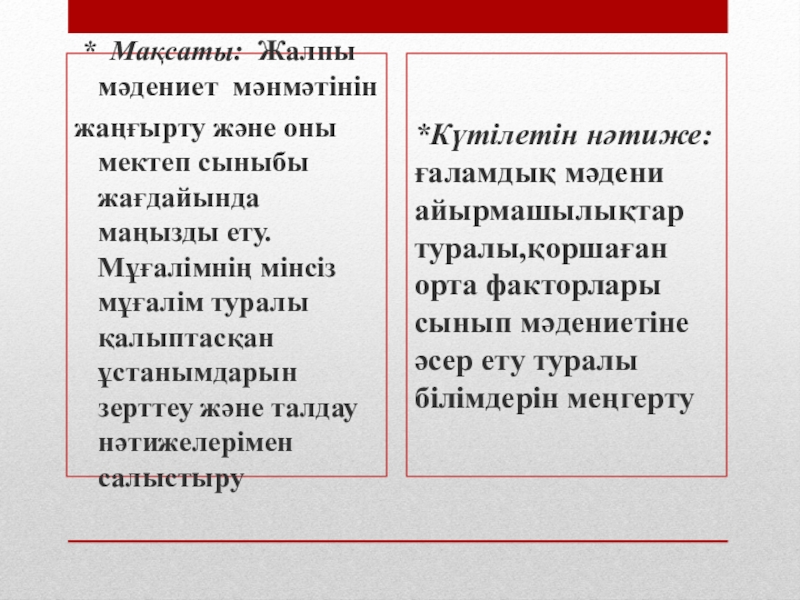 *Күтілетін нәтиже: ғаламдық мәдени айырмашылықтар туралы,қоршаған орта факторлары сынып мәдениетіне әсер ету туралы білімдерін меңгерту