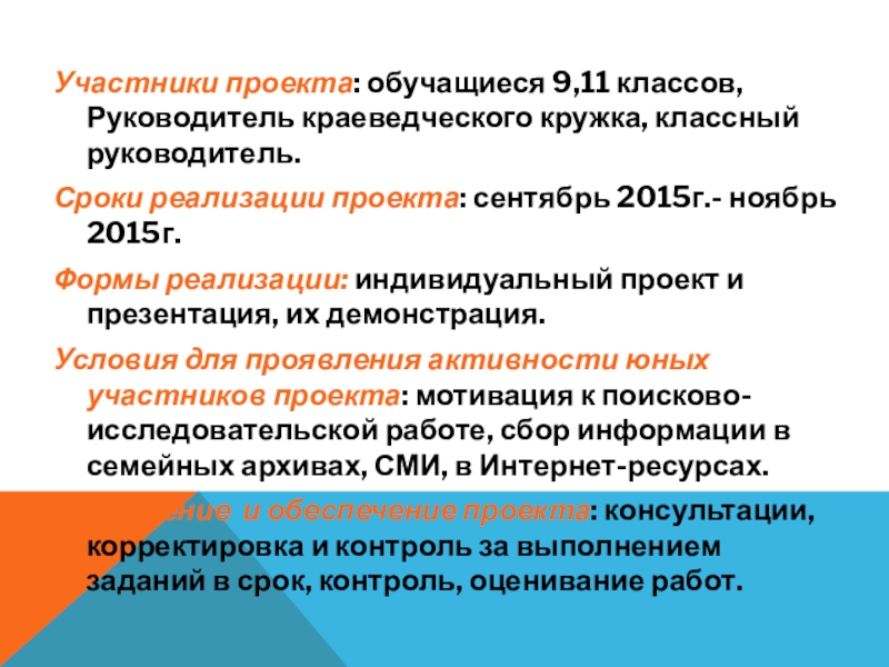 Слайд 4Участники проекта: обучащиеся 9,11 классов, Руководитель краеведческого кружка, классный руководитель.