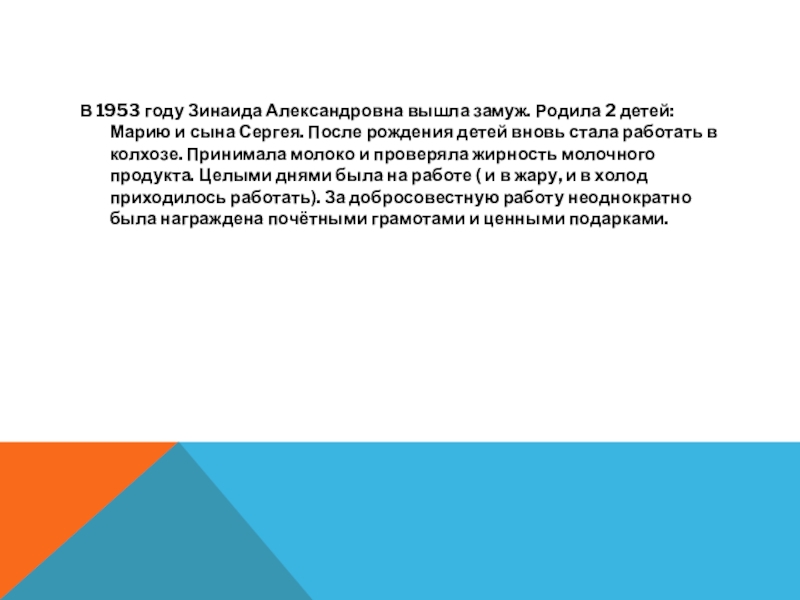 и сына Сергея. После рождения детей вновь стала работать в колхозе. Принимала молоко и проверяла жирность молочного продукта. Целыми днями была на работе ( и в жару, и в холод приходилось работать). За добросовестную работу неоднократно была награждена почётными грамотами и ценными подарками.