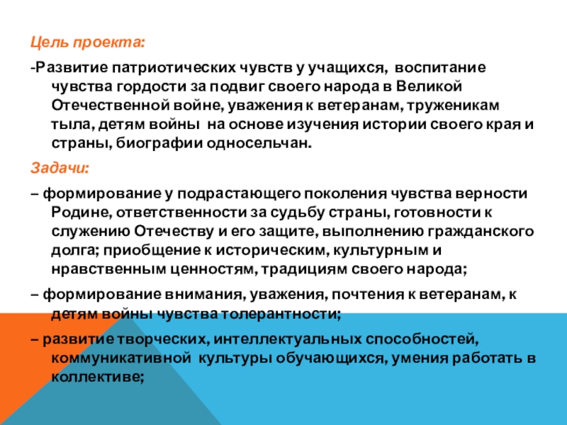 своего народа в Великой Отечественной войне, уважения к ветеранам, труженикам тыла, детям войны на основе изучения истории своего края и страны, биографии односельчан.
