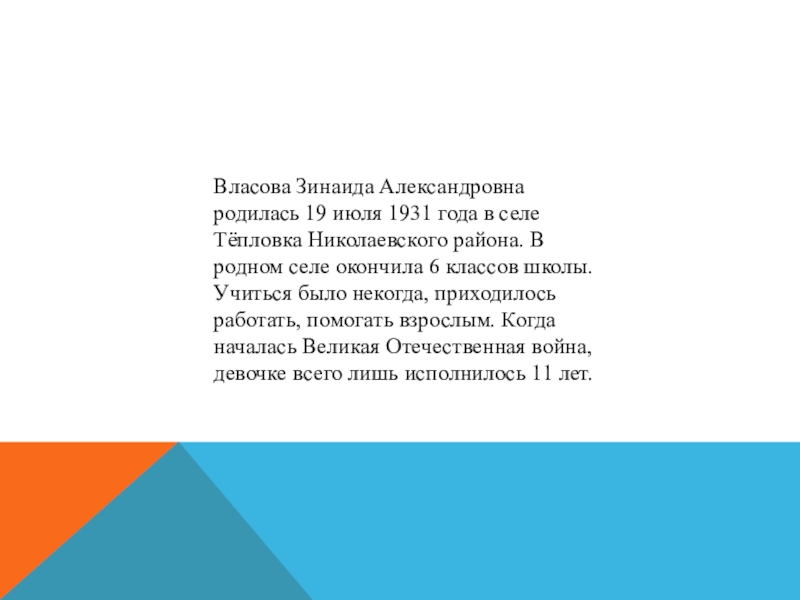 Власова Зинаида Александровна родилась 19 июля 1931 года в селе Тёпловка