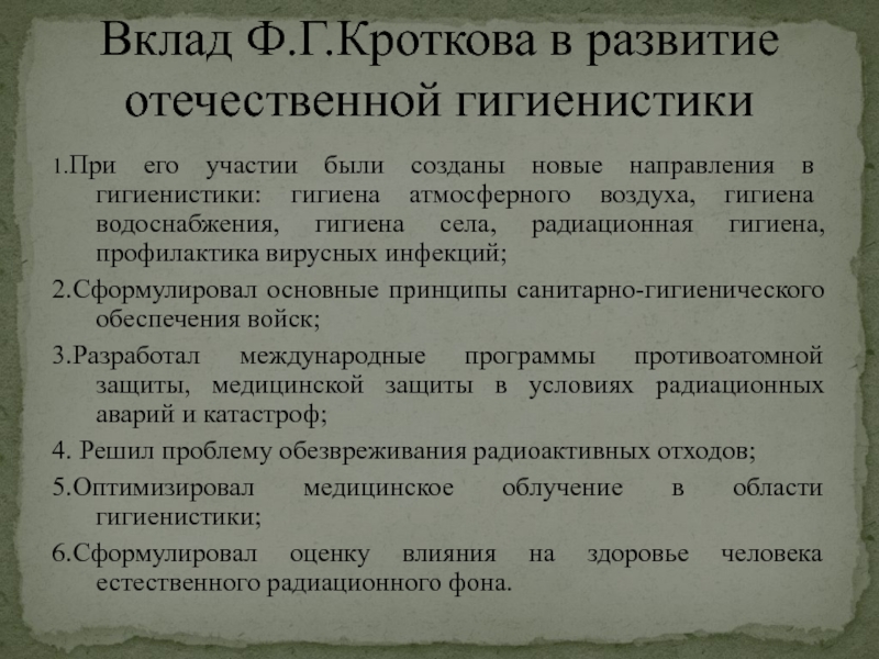 Вклад Ф.Г.Кроткова в развитие отечественной гигиенистики