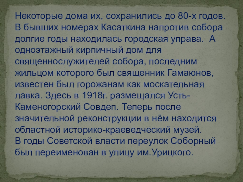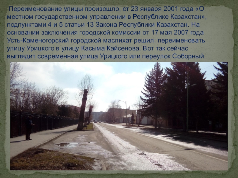 государственном управлении в Республике Казахстан», подпунктами 4 и 5 статьи 13 Закона Республики Казахстан. На основании заключения городской комиссии от 17 мая 2007 года Усть-Каменогорский городской маслихат решил: переименовать улицу Урицкого в улицу Касыма Кайсенова. Вот так сейчас выглядит современная улица Урицкого или переулок Соборный.