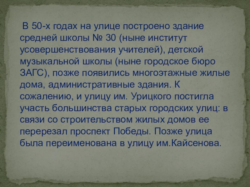 (ныне институт усовершенствования учителей), детской музыкальной школы (ныне городское бюро ЗАГС), позже появились многоэтажные жилые дома, административные здания. К сожалению, и улицу им. Урицкого постигла участь большинства старых городских улиц: в связи со строительством жилых домов ее перерезал проспект Победы. Позже улица была переименована в улицу им.Кайсенова.