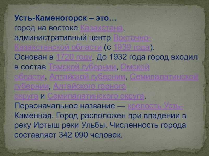 Первоначальное название — крепость Усть-Каменная. Город расположен при впадении в реку Иртыш реки Ульбы. Численность города составляет 342 090 человек.
