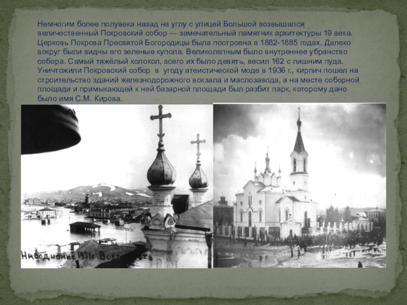 Покровский собор — замечательный памятник архитектуры 19 века. Церковь Покрова Пресвятой Богородицы была построена в 1882-1885 годах. Далеко вокруг были видны его зеленые купола. Великолепным было внутреннее убранство собора. Самый тяжёлый колокол, всего их было девять, весил 162 с лишним пуда. Уничтожили Покровский собор в угоду атеистической моде в 1936 г., кирпич пошел на строительство зданий железнодорожного вокзала и маслозавода, а на месте соборной площади и примыкающей к ней базарной площади был разбит парк, которому дано было имя С.М. Кирова.