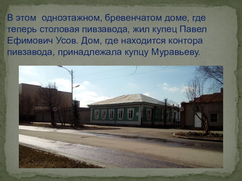 Слайд 15В этом одноэтажном, бревенчатом доме, где теперь столовая пивзавода, жил купец