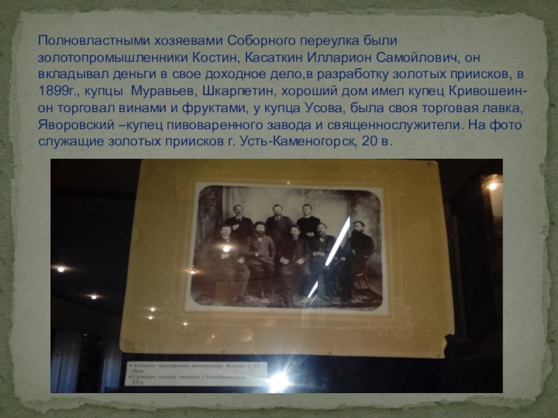 Слайд 14Полновластными хозяевами Соборного переулка были золотопромышленники Костин, Касаткин Илларион Самойлович, он