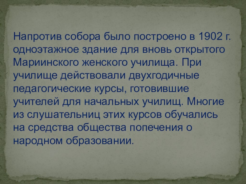открытого Мариинского женского училища. При училище действовали двухгодичные педагогические курсы, готовившие учителей для начальных училищ. Многие из слушательниц этих курсов обучались на средства общества попечения о народном образовании.