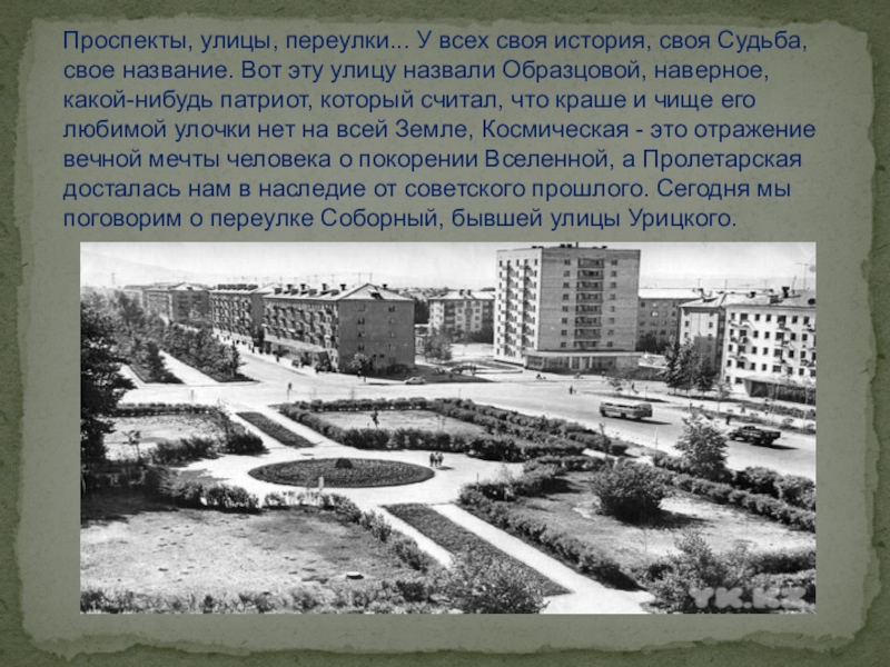 Вот эту улицу назвали Образцовой, наверное, какой-нибудь патриот, который считал, что краше и чище его любимой улочки нет на всей Земле, Космическая - это отражение вечной мечты человека о покорении Вселенной, а Пролетарская досталась нам в наследие от советского прошлого. Сегодня мы поговорим о переулке Соборный, бывшей улицы Урицкого.