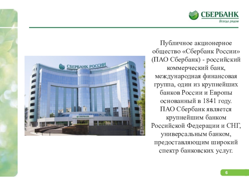 Слайд 6Публичное акционерное общество «Сбербанк России» (ПАО Сбербанк) - российский коммерческий банк,